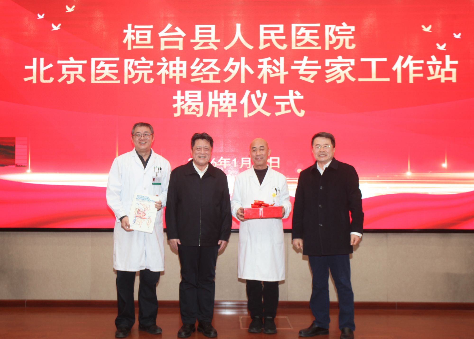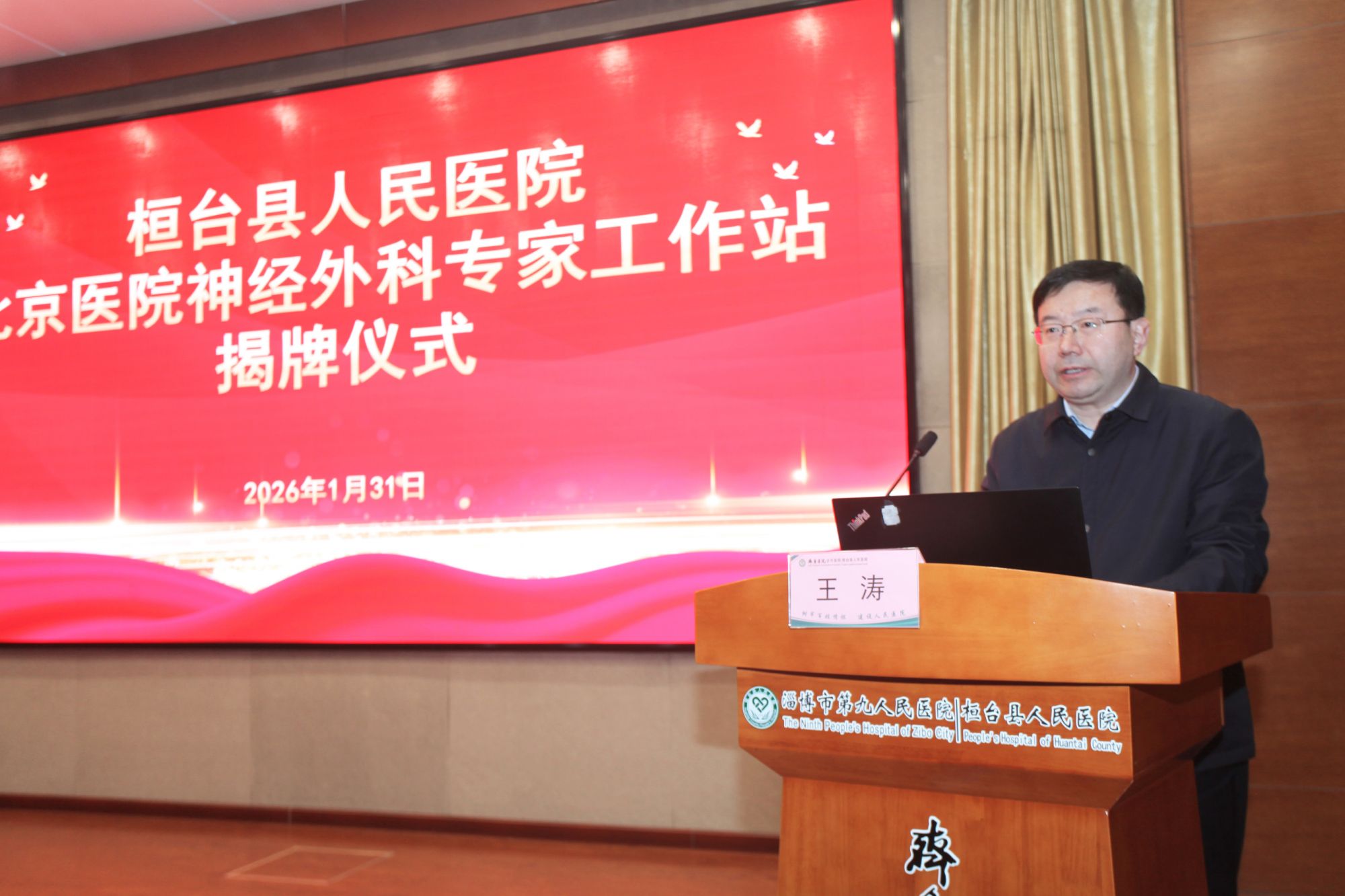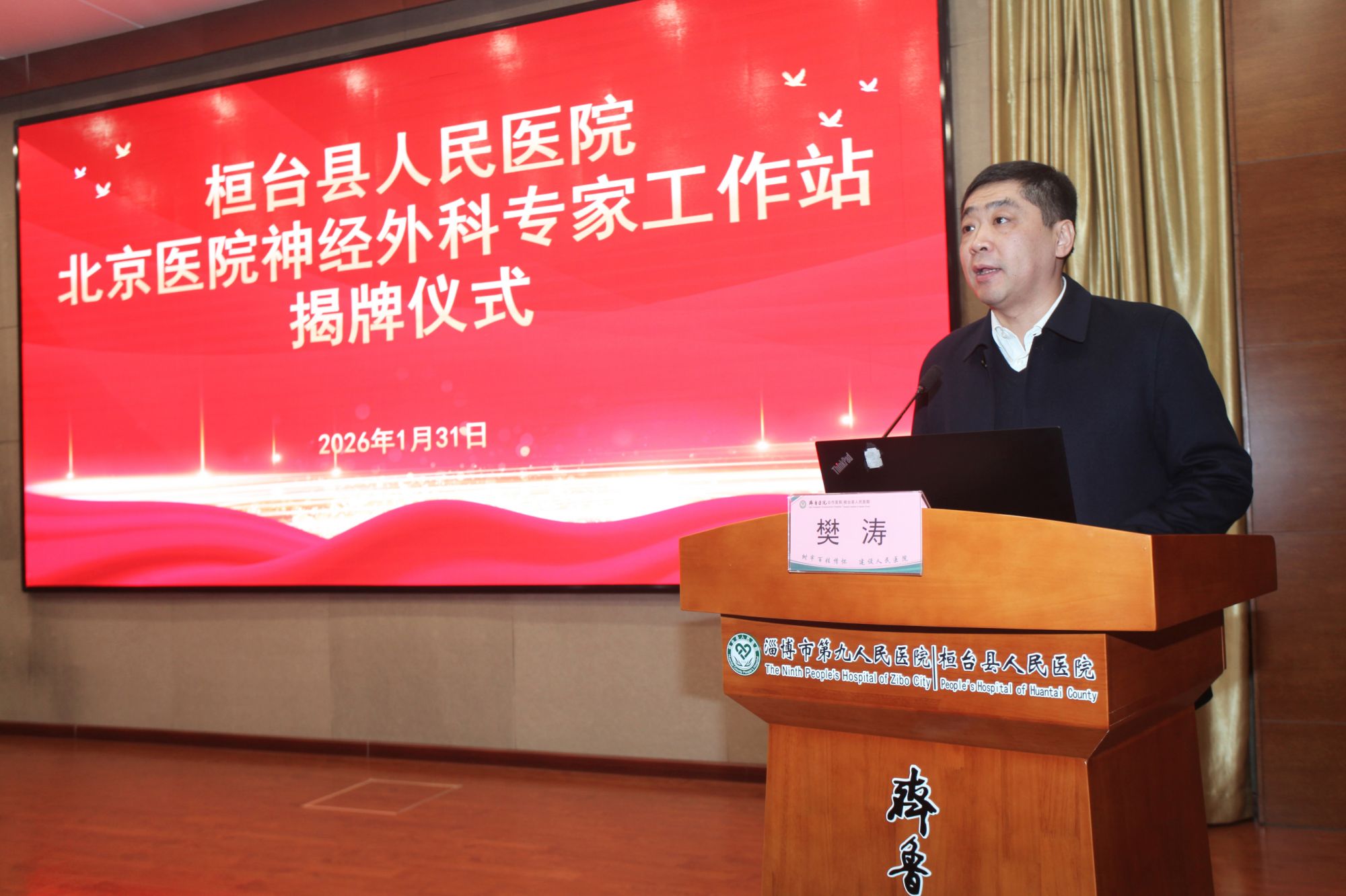 王涛局长主持揭牌仪式 张奎国在致辞中表示,北京医院是一所承载着光荣历史与卓越声誉的医学殿堂,特别是北京医院神经外科作为国家级临床重点专科,以其在神经外科疾病及脑血管病诊治领域的顶尖实力,成为全国同行景仰的研修中心。工作站的成立,必将为医院在临床技术革新、复杂疾病诊疗、科研思维训练乃至管理理念升级上注入为最强劲的、可持续发展的核心动力。医院将以最虚心的态度学习,以最周到服务保障,以最扎实行动对接,确保专家的每一份智慧都能在桓台落地生根,开花结果。相信在专家们悉心帮助指导下,医院神经外科各关键领域必将实现突破性提升,迎来跨越式发展,进一步织密县域人民群众神经系统健康防护网,让桓台及周边地区群众能够享受到国内顶级的神经外科精准诊疗服务。 王长春教授表示,此次在桓台县人民医院设立专家工作站,是推动国家优质医疗资源下沉基层的重要举措。团队将通过技术帮扶、人才培养、远程协作等形式,切实将北京的优质医疗资源带到桓台,提升区域神经疾病诊疗能力,惠及更多群众。同时,依托工作站平台,积极探索跨区域医疗协作创新模式,共同构建高效便民、覆盖基层的医疗服务体系。 樊涛表示,北京医院神经外科专家工作站的成立是桓台县积极对接高端医疗资源、加强名医专家引进工作取得的又一重大突破。他强调,医院要在专家团队的精心指导下,强化专科建设,优化服务流程,培养本土骨干,力争在医疗技术、科研创新、人才培养等方面实现全面跃升,真正把工作站建设成为技术高超、服务优质、群众信赖的品牌专科,大幅提升我县在神经外科等复杂疑难疾病领域的救治水平,切实减轻群众外出求医的负担,让桓台及周边百姓在家门口就能享受到国家级专家的优质医疗服务。 王长春教授、樊涛副县长为“北京医院神经外科专家工作站”揭牌。 王长春教授向医院赠送医疗物品和书籍。 会上,裴傲教授、刘加春教授先后进行学术分享。