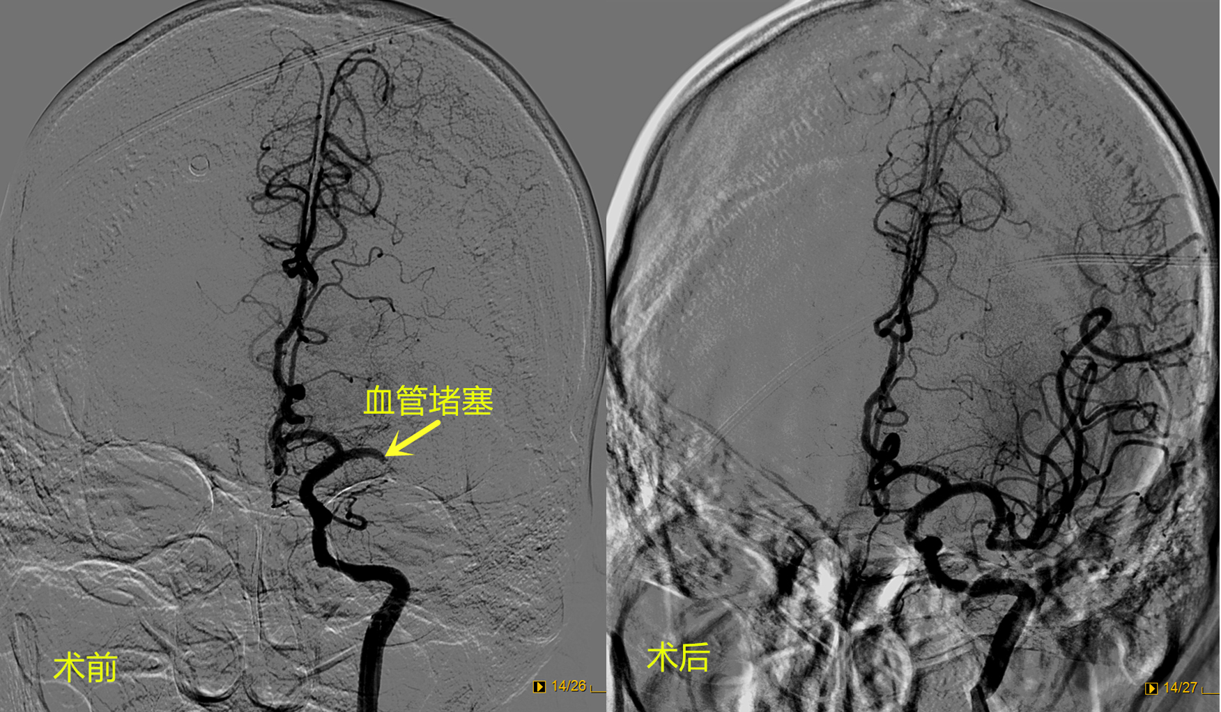 81岁的巩大爷突然出现言语不清、右侧肢体完全瘫痪,家人紧急送至我院急诊科。立即启动卒中绿色通道,紧急进行了颅脑CT检查,考虑为心脏栓子脱落导致脑梗死,卒中小组立即为巩大爷进行了静脉溶栓。考虑到栓子比较大,单纯静脉溶栓无法将栓子溶解,医生认为可以进一步采取介入取栓治疗。但巩大爷年龄大,合并多年的心脏病,手术的难度和风险较高,与家属沟通后,先进行脑血管造影,术中发现患者左侧大脑主干血管堵塞,静脉溶栓药物没能把栓子溶开,介入团队医生立即为巩大爷进行了介入取栓手术,取出2块栓子后再次造影显示左侧大脑血管完全开通,血流恢复正常。