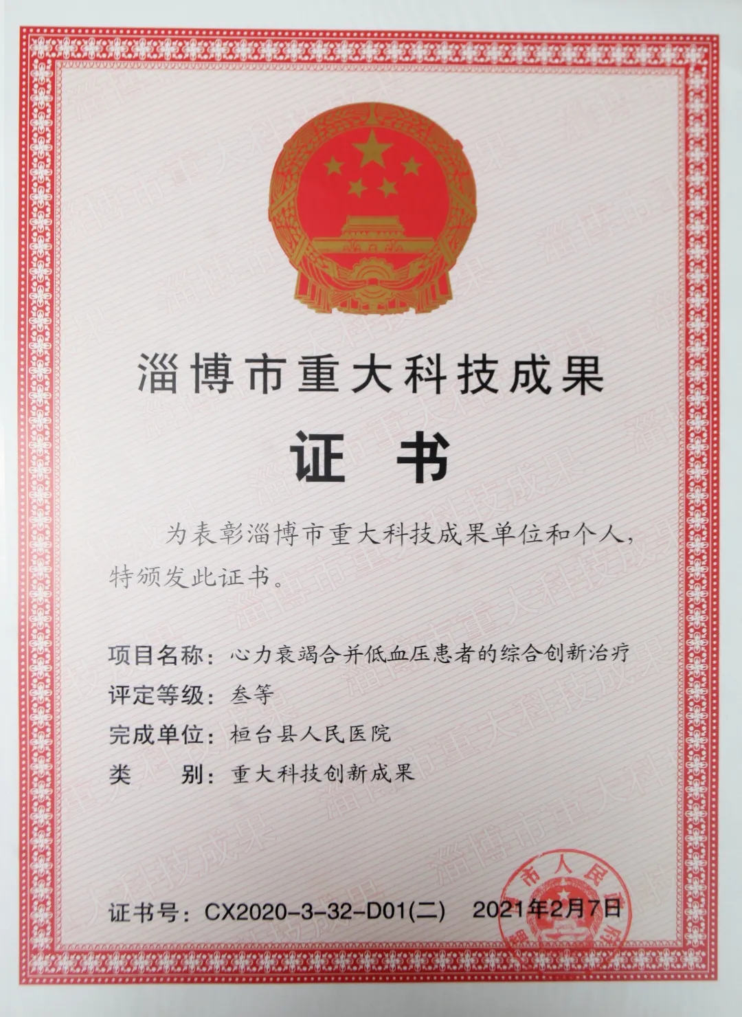 近日,淄博市人民政府发布了《关于公布2020年度淄博市重大科技成果的决定》,桓台县人民医院心内科二病区申报的“心力衰竭合并低血压患者的综合创新治疗”项目荣获2020年度淄博市重大科技成果三等奖。