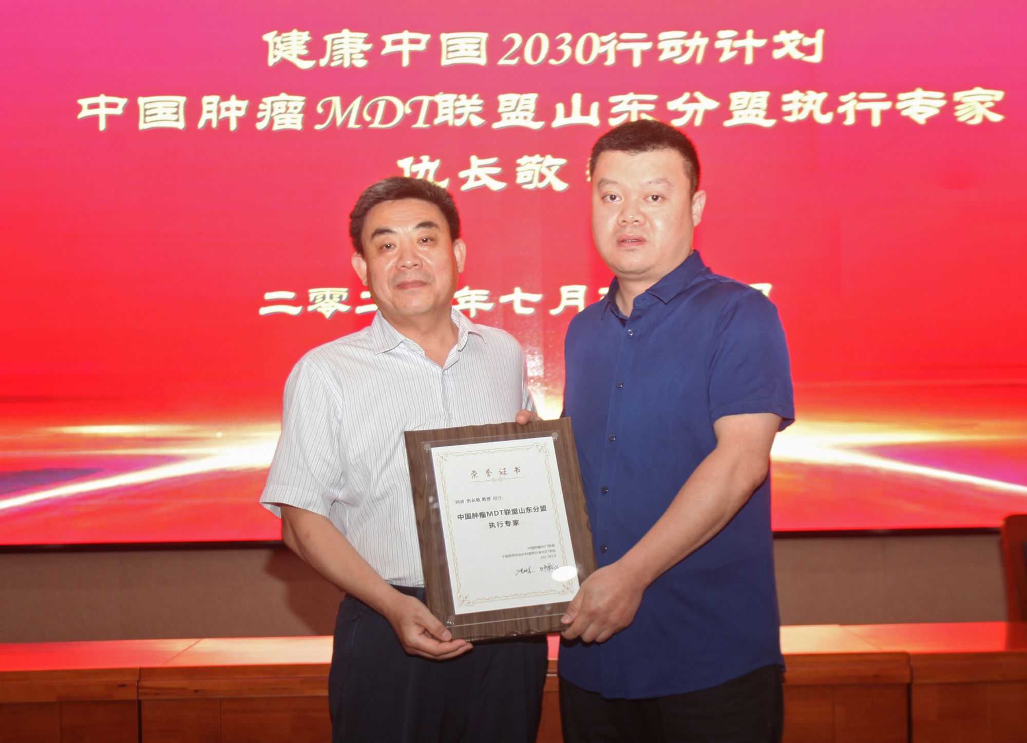 ●桓台县人民医院副院长张宝忠在致辞中表示,今天的授牌仪式证明了我院肿瘤MDT团队建设的决心。在下一步工作中,我们将通过多层次的学术交流与合作,建设肿瘤MDT联盟共建模式,加强医院之间的协作与平台搭建,资源共享,共同推动“健康中国2030”肿瘤MDT规范化推广工作。 ● 桓台县卫健局党组成员宋希君指出,桓台县人民医院作为首批进入山东省肿瘤MDT联盟成员,是对前期工作的充分认可和肯定,也带来了新的机遇和挑战,希望县医院以此次会议为新的起点,明确目标、坚定信心、扎实工作、不断努力,为加快推进健康桓台建设作出新的贡献。 ● 山东省立医院李辰生教授介绍了肿瘤MDT的优势。希望在肿瘤MDT联盟的平台上,在卫健局的领导下,医院能够提高诊疗技术水平,更好地服务桓台人民。 ● 山东省立医院李辰生教授为我院胃肠外科主任仇长敬颁发中国肿瘤MDT联盟分盟执行专家荣誉证书。 ● 宋希君、李辰生、张宝忠共同为我院消化系统肿瘤多学科诊疗创建单位揭牌。 淄博市第四人民医院张强教授作《2021CSCO胃癌肿瘤指南更新》的专题讲座。 邹平市人民医院苏忠教授、淄博市第一医院孙晓东教授、淄博市市立医院冷昌俊教授就指南更新进行了进一步解读。 桓台县人民医院院长助理、医务科主任马刚进行《桓台县人民医院MDT建设初步规划》专题讲座。 胃肠外科主治医师耿鹏就晚期胃癌转化治疗成功案例进行了分享。 淄博市市立医院赵旭教授、邹平市人民医院孙波教授、高青县人民医院王帆教授就案例与大家进行了讨论。