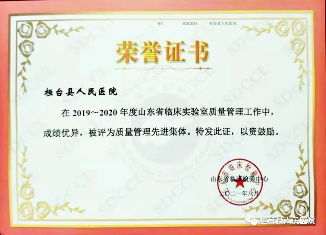 近日,桓台县人民医院检验科喜获“2019-2020年度山东省临床实验室质量管理先进集体”,“抗击新冠肺炎疫情先进集体”两个省级荣誉称号。