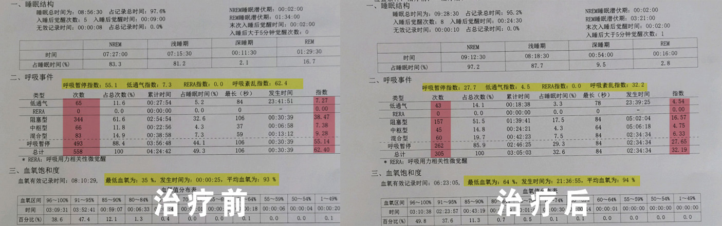 69岁的刘大爷因“左侧视野缺失1天”入住我院神经内科,行颅脑磁共振检查显示脑梗死。治疗过程中患者有时出现幻视、幻听,胡言乱语,夜间明显,追问病史,发现患者夜间睡眠差,打鼾严重。进行睡眠监测发现重度阻塞性睡眠呼吸暂停合并重度低氧血症,遂转入呼吸与危重症医学科继续治疗,经过治疗再次检测,呼吸暂停次数较前明显减少,最低血氧饱和度明显上升。