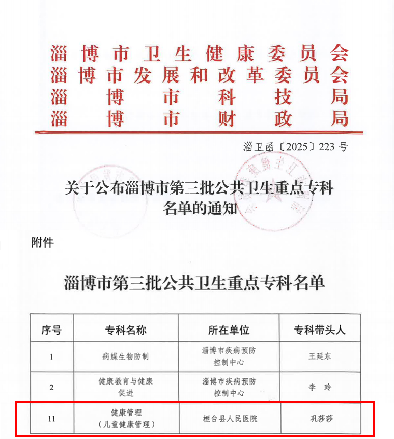 近日,淄博市卫健委公布市第三批公共卫生重点专科名单,我院健康管理(儿童健康管理)专科获批淄博市公共卫生重点专科。截至目前,我院省市级重点学(专)科21个,实现重点专科全域覆盖。